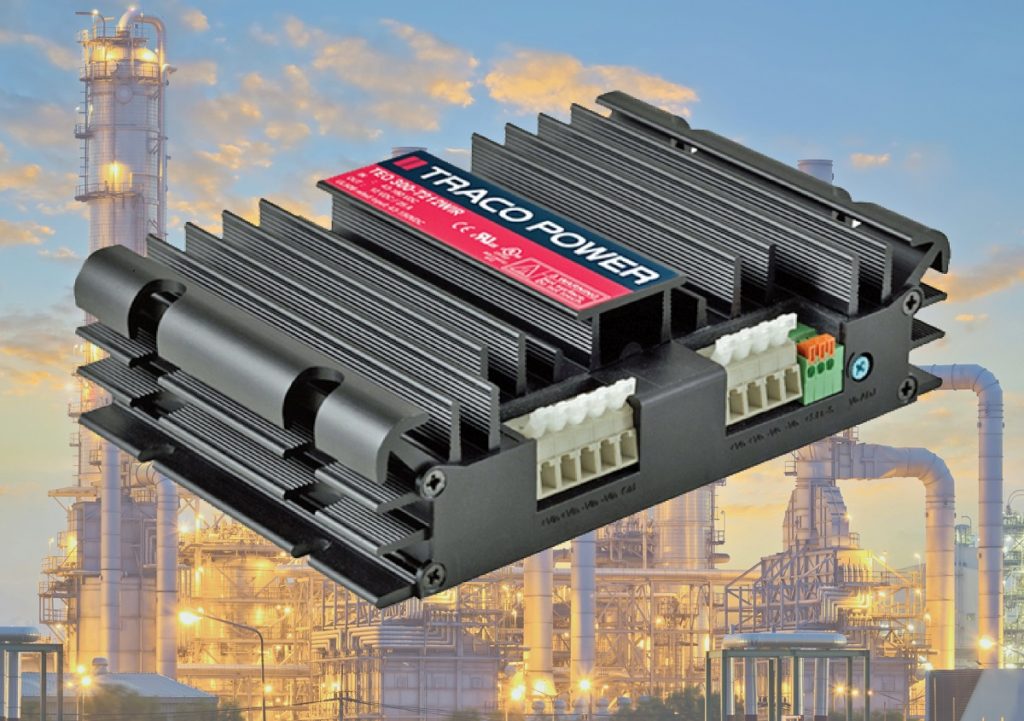 Made by Traco, TEQ 300WIR units feature extra wide input voltage ranges of 18 to 75VDC and 43 to 160VDC. Interestingly, the nominal input voltages of 48, 72, 96 and 110 VDC can be applied while a ±40% deviation of nominal input voltage does not affect the function. This means that the power blocks can cope with brownouts (0.6 x Vnom x 100ms) and transient voltages (1.4 x Vnom x 1s) as defined by EN50155 – not only for a limited duration, but permanently.